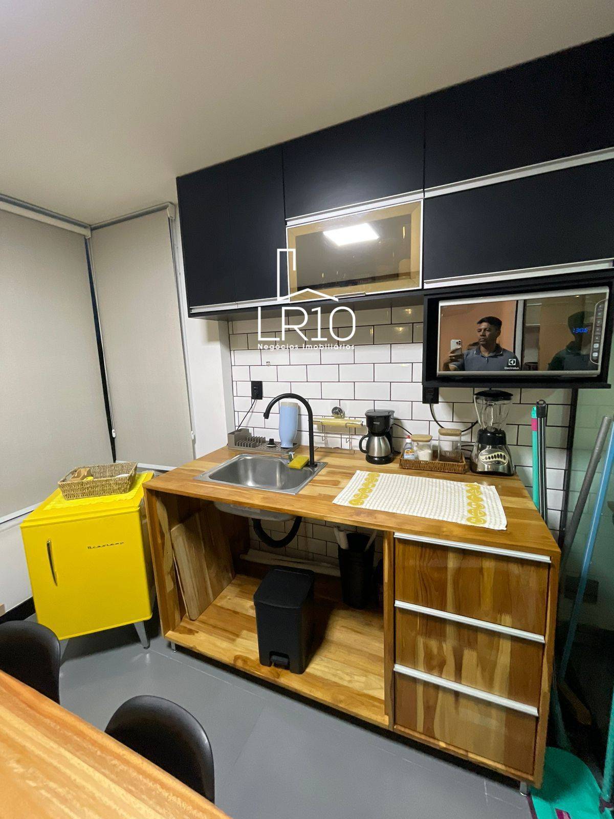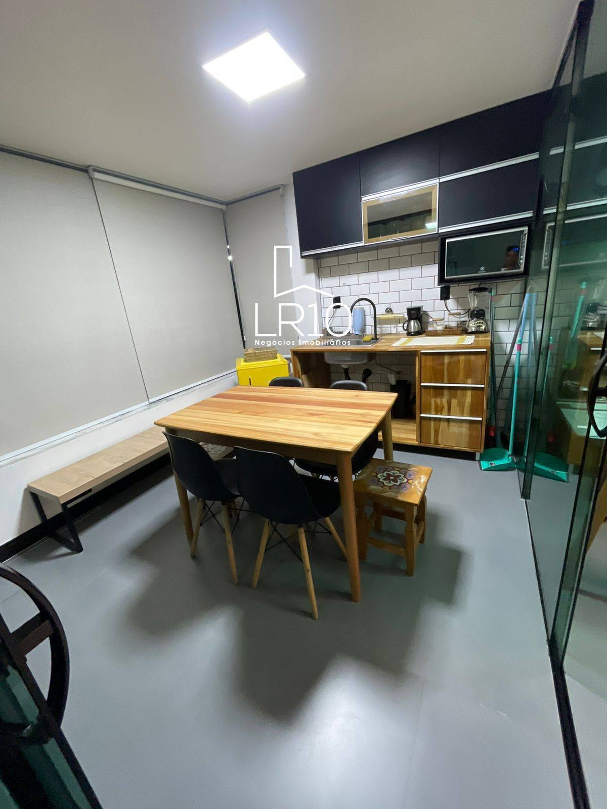 A copa gourmet, com bancada em madeira, armários, geladeira, micro-ondas e cafeteira, garante praticidade.