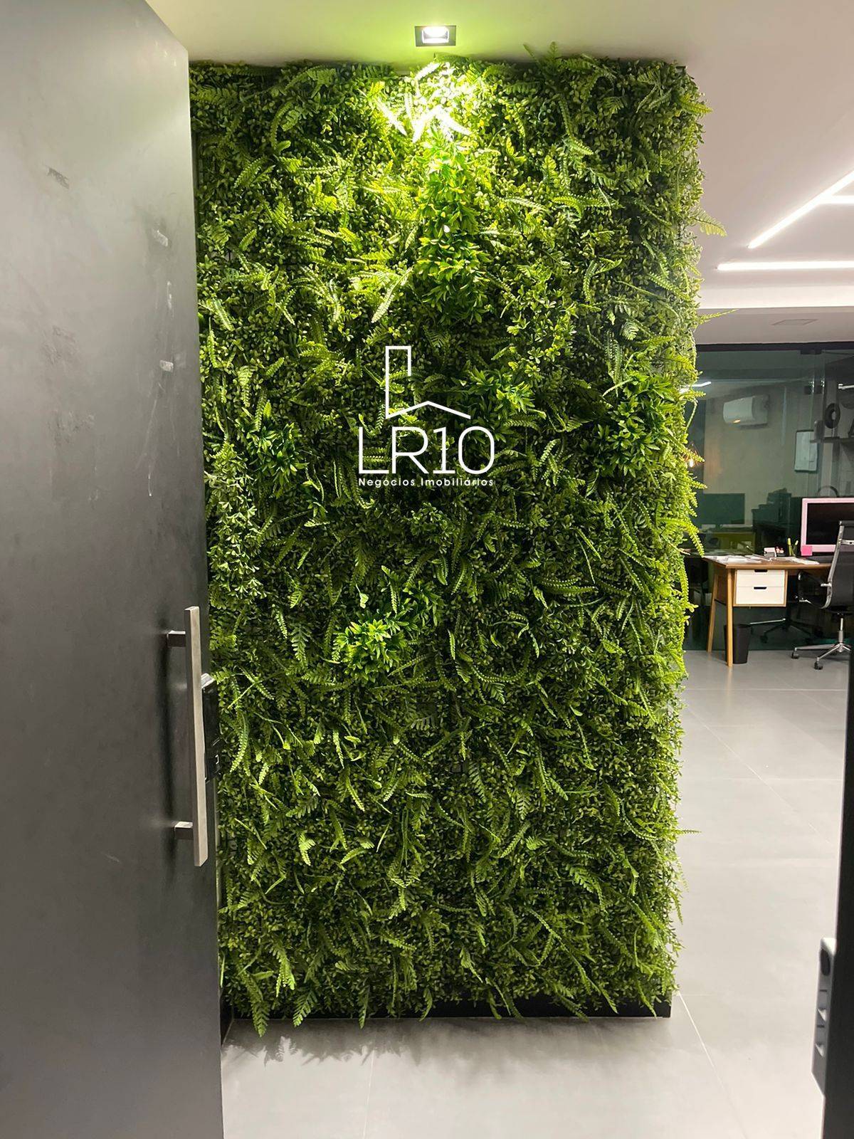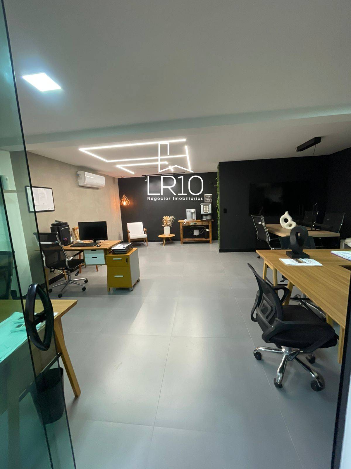 Amplo espaço integrado, dividido por painéis de vidro, estações de trabalho, sala privativa com sofá.